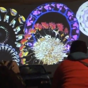 Software programmed in MaxMSP-Jitter that guides the visitors thru the recording of an animation loop / A Kinect is used to detect the peoples presence and location and ensure the animation is complete / Each animation receives a serial number and a ticket is printed with a barcode / Remote control app developed for an iPad in OpenFrameworks to select the theme before recording / Software developed in MaxMSP-Jitter for the playback, the compositing and the video mapping
