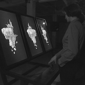 Dedicated photographic capture software programmed in MaxMSP-Jitter / Allow the visitors to draw with their bodies using an accumulation effect applied to a live camera stream (pseudo long exposure) / Visitors witness their creation in real time via a video projection in front of them then it's automatically printed when they stop moving