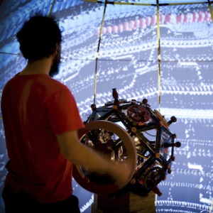 Custom interactive 3d engine developed in MaxMSP-Jitter to handle animations and trajectories of unique objects or swarms of objects / Design of an Arduino shield to connect to IR sensors to measure rotation of nine cranks disposed on a sphere in the center of the space / The screen (a custom made half sphere designed by Marcio) is projected upon thru a round mirror and a precise mapping is obtained via MadMapper / They are actuated by the visitors to control the installation in different ways depending on the scene we're in